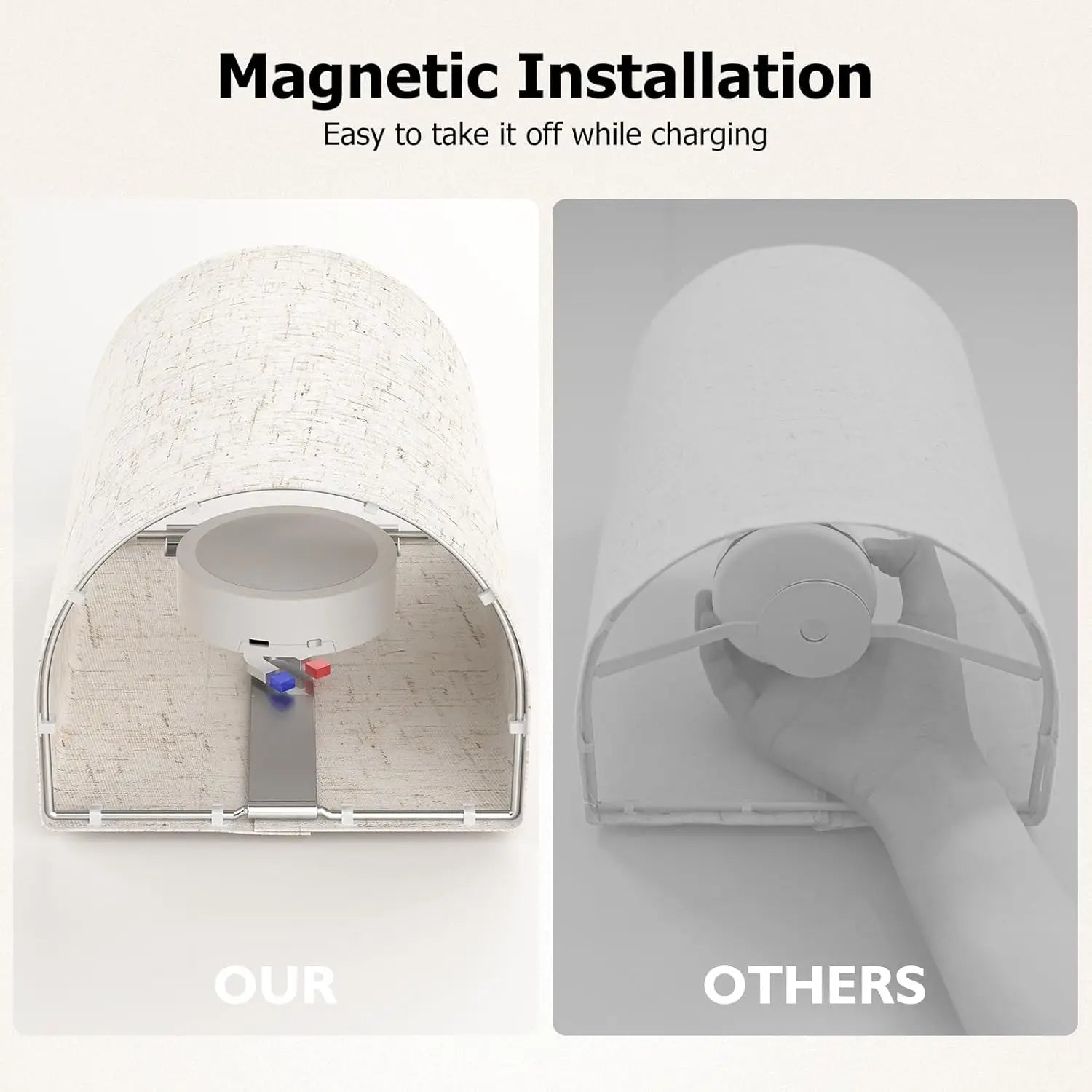 [Magnetic Connection & Easy to Install ] Our modern universal rechargeable wall sconces were no hard wires and no cords. A truly wireless wall sconce with magnetic puck lights, which are vertically magnet on the mounting plate, so that the lampshade has no shadow and the light is more uniform. Easy to take it off, and charge it at any time.